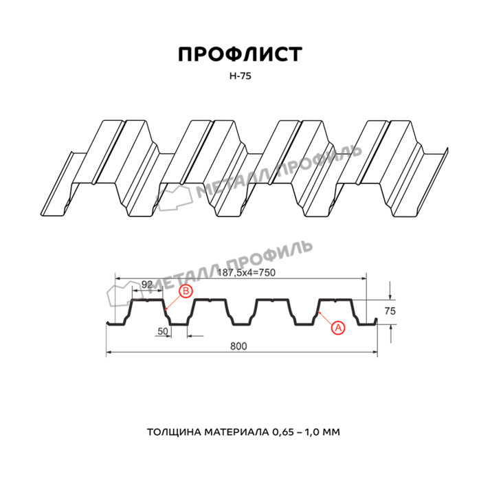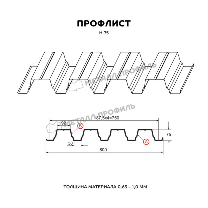 Предлагаем купить профилированный лист Н-75 в Броннице. Он является оцинкованным стальным материалом, имеющим покрытие. Толщина стальной основы с защитным покрытием составляет 0.8 мм. После проката на специализированном оборудовании лист приобретает рисунок из повторяющихся волн, что значительно увеличивает его жесткость по сравнению с плоским материалом.
